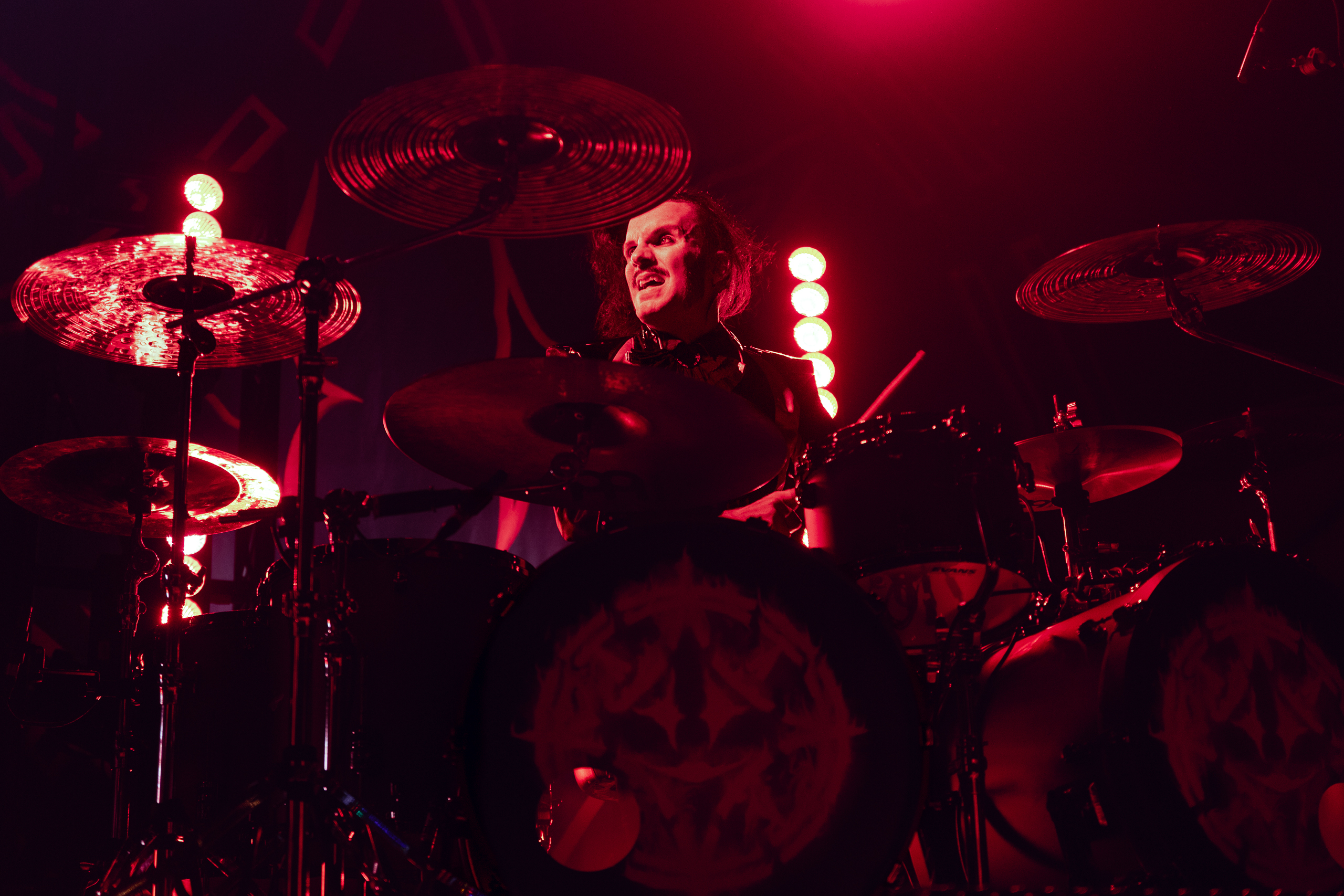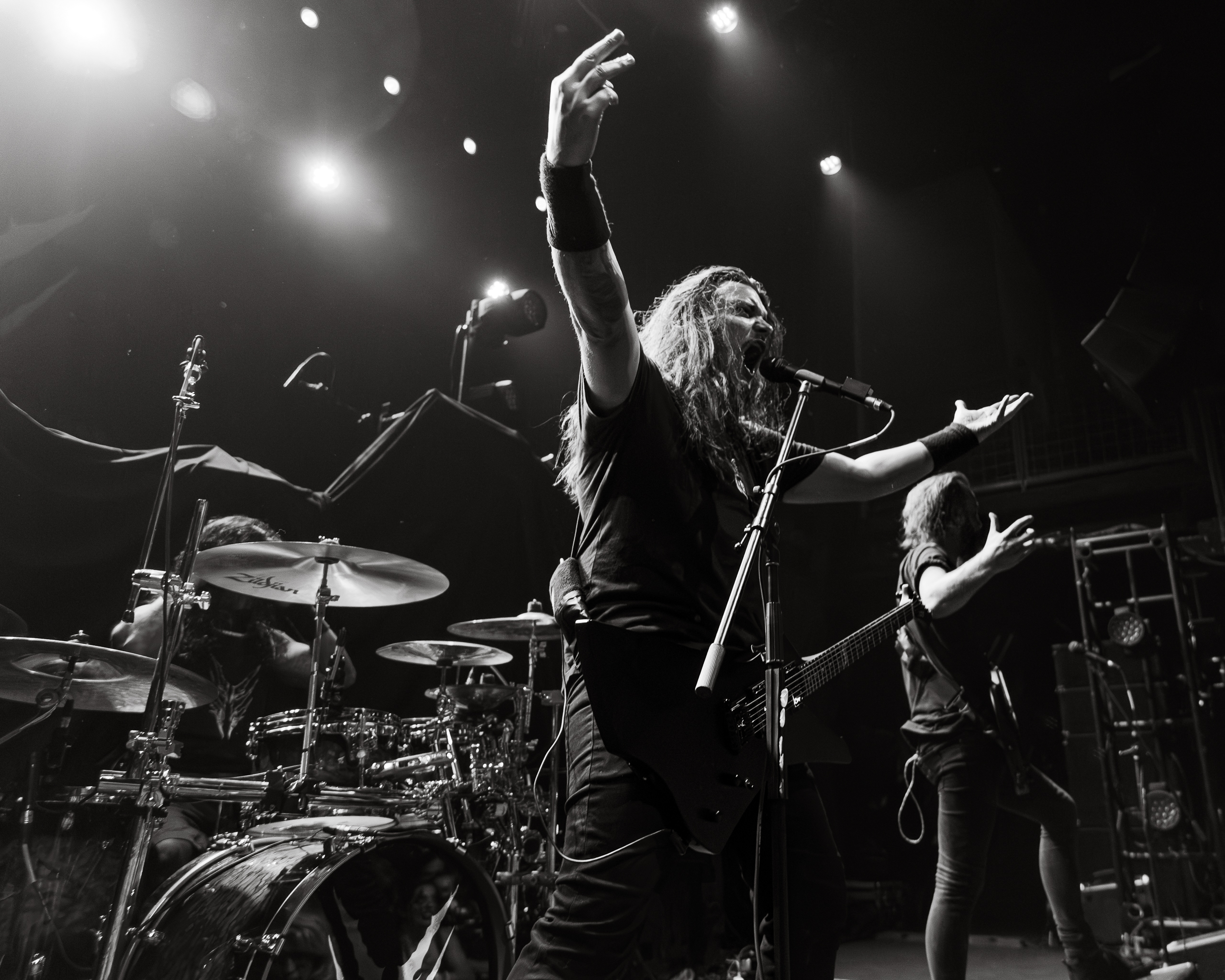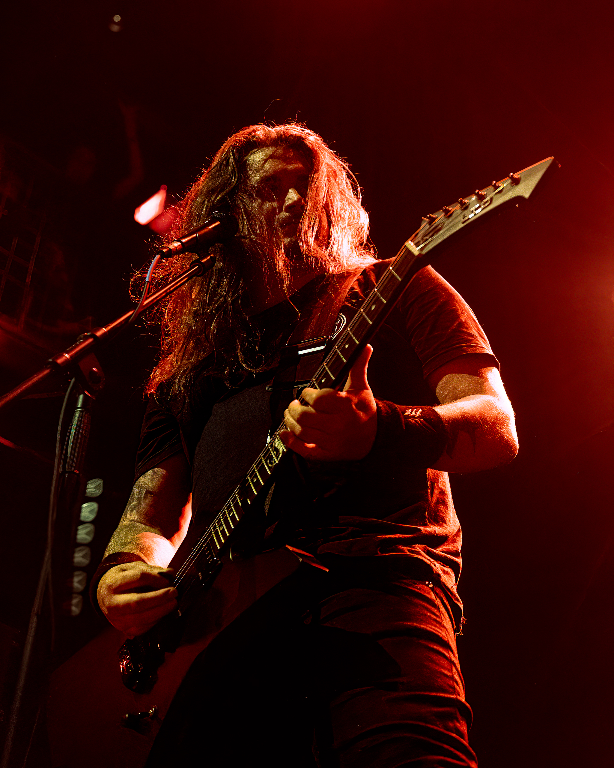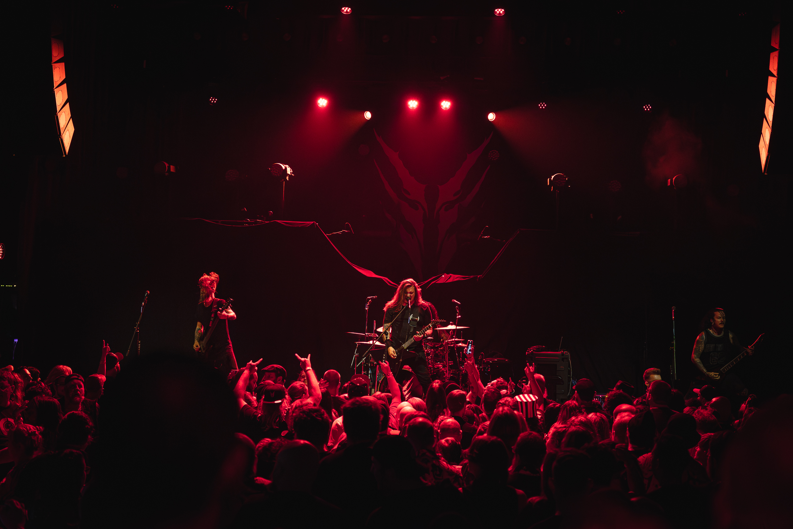 Next up was the Swedish death metal powerhouse, Orbit Culture, who ignited the stage with an explosive intensity that never waned. Starting with “North Star of Nija,” they whipped the crowd into a frenzy that culminated during the third song, “From the Inside.” This led to a frenzy of crowd surfers, resulting in photographers being ejected from the photo pit early. As their eight-song set continued, the audience’s enthusiasm only grew, culminating in swirling circle pits in the middle of the venue, with more and more fans riding the crowd’s wave. By the end of their performance, the audience was ravenous for the main event.