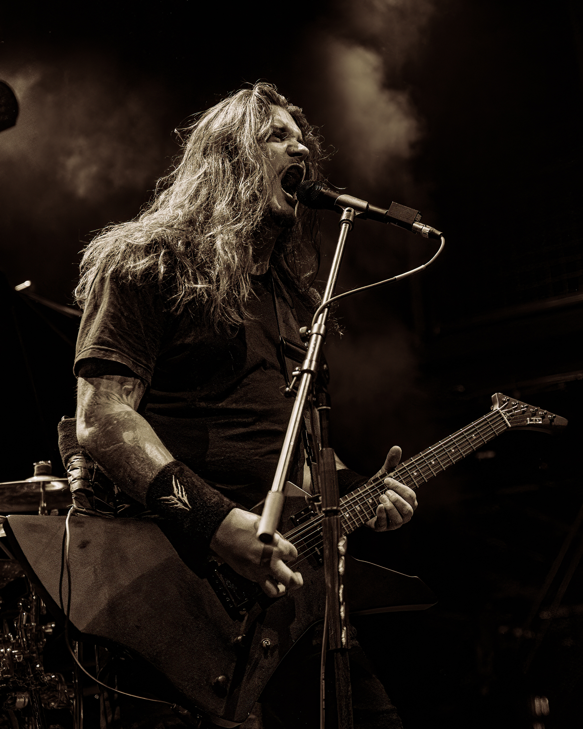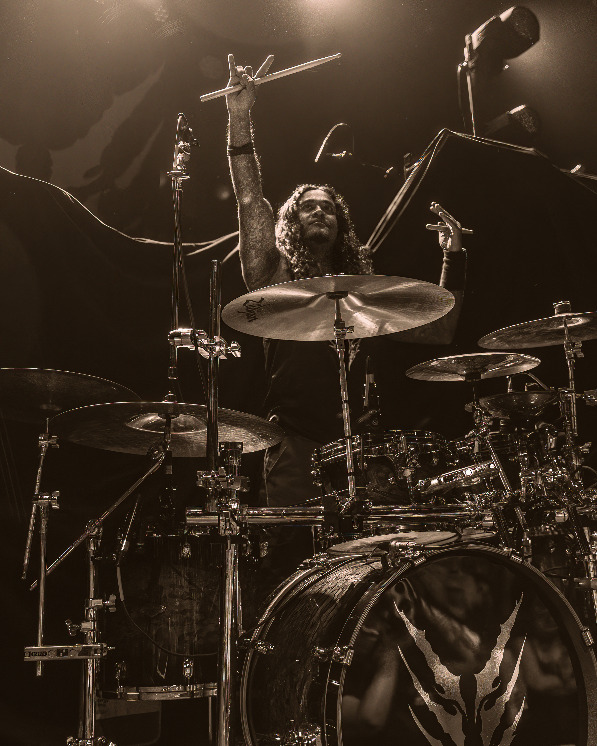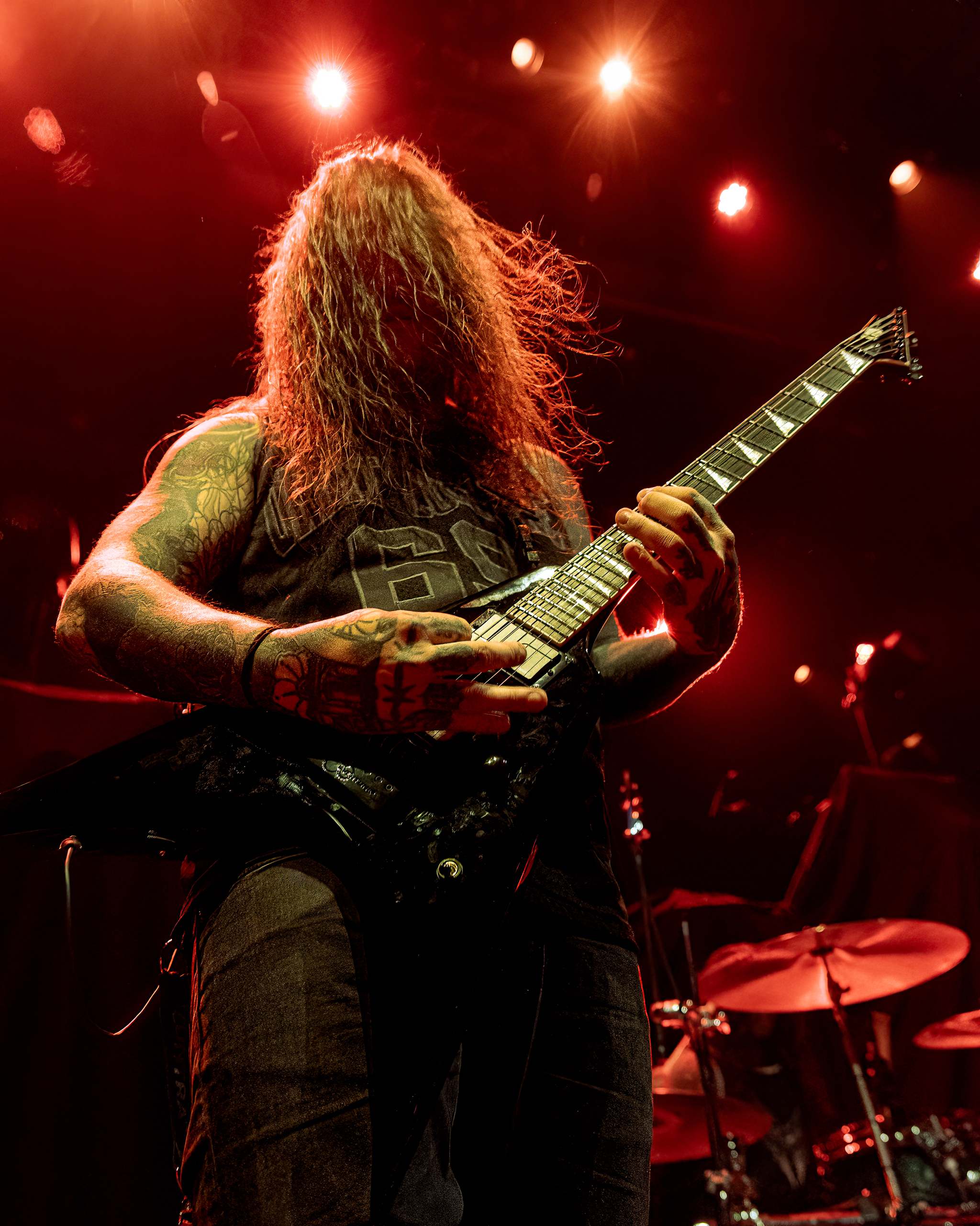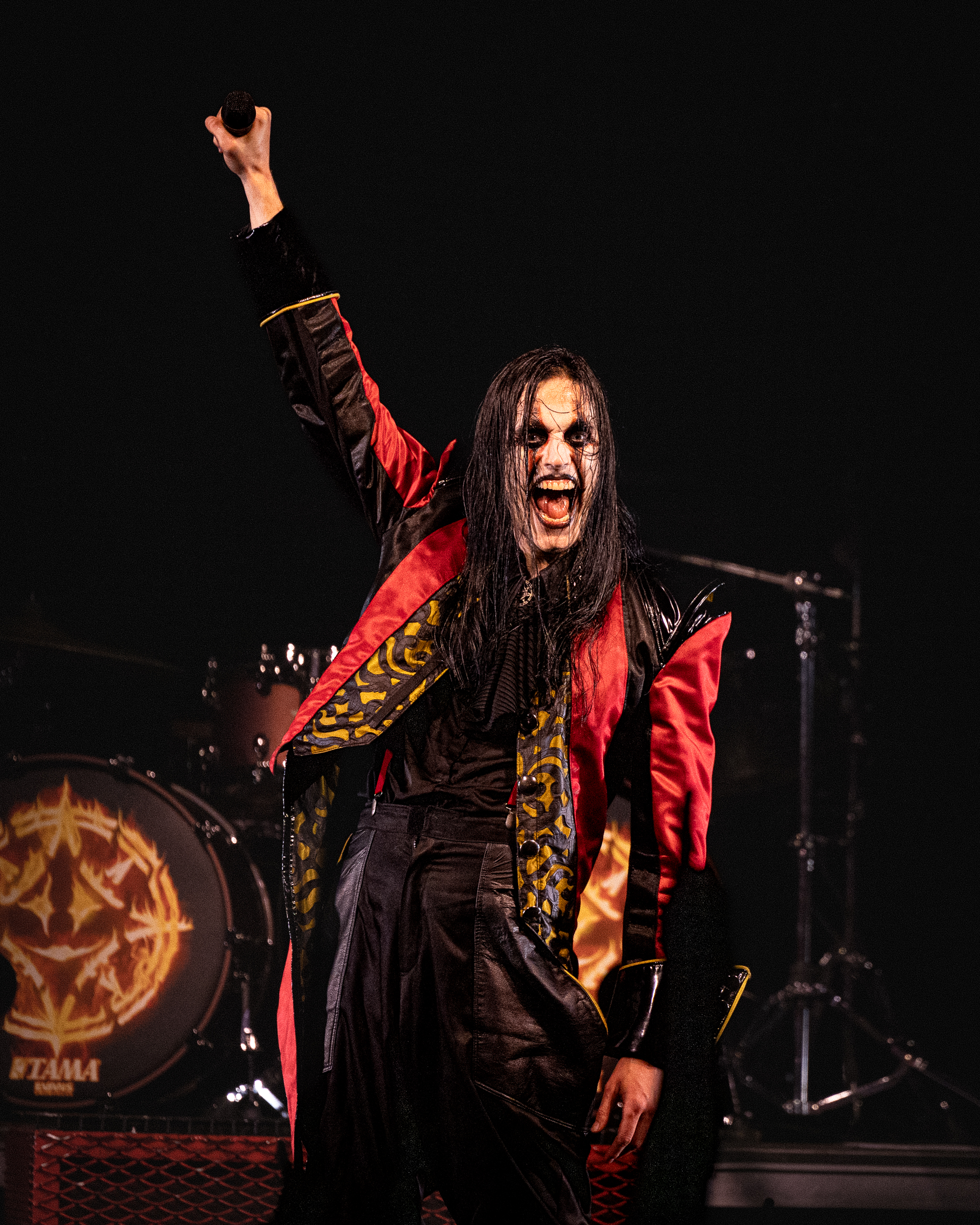Next up was the Swedish death metal powerhouse, Orbit Culture, who ignited the stage with an explosive intensity that never waned. Starting with “North Star of Nija,” they whipped the crowd into a frenzy that culminated during the third song, “From the Inside.” This led to a frenzy of crowd surfers, resulting in photographers being ejected from the photo pit early. As their eight-song set continued, the audience’s enthusiasm only grew, culminating in swirling circle pits in the middle of the venue, with more and more fans riding the crowd’s wave. By the end of their performance, the audience was ravenous for the main event.