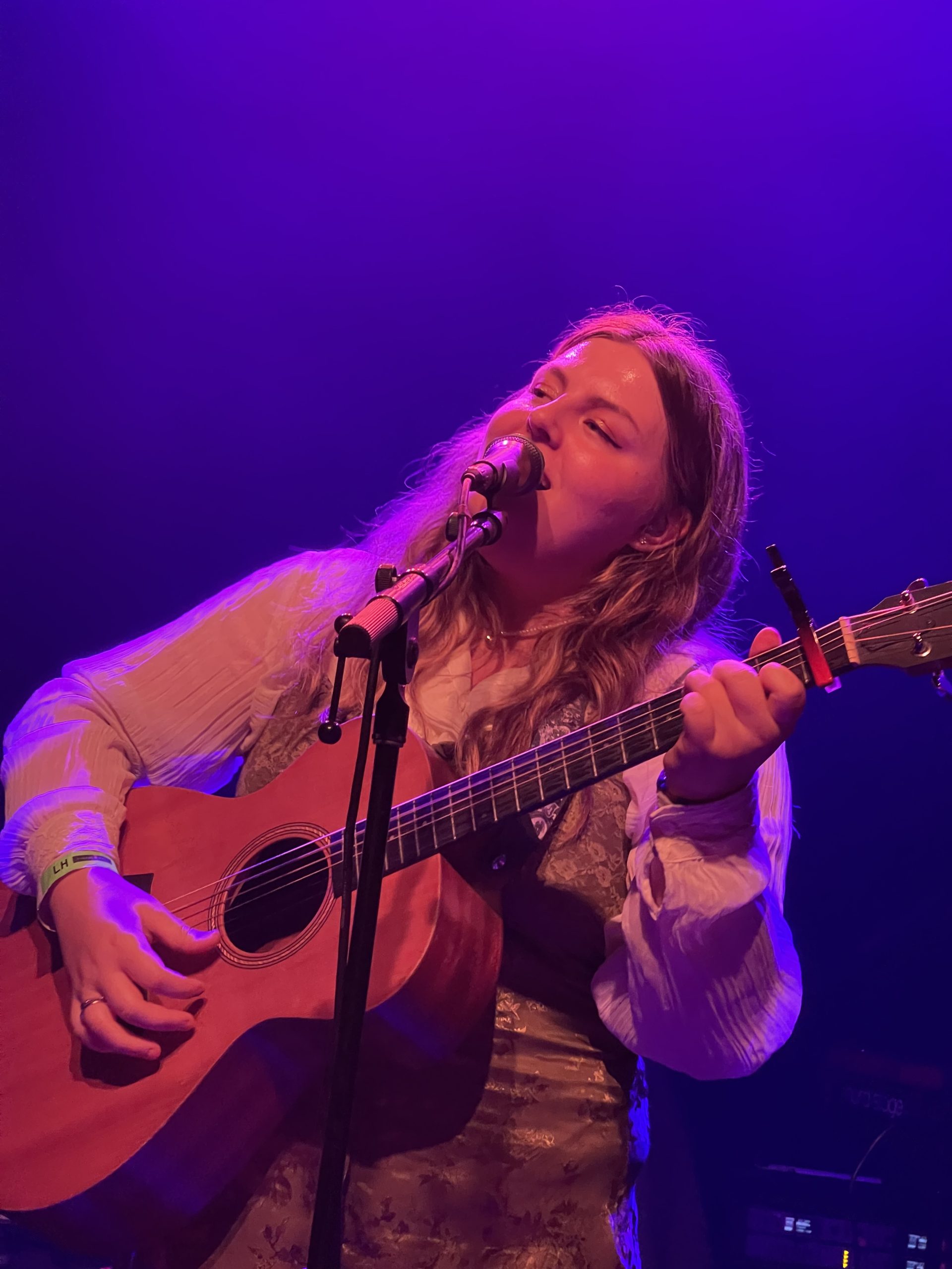 The next act, Sophie Holohan, floated on stage and spoke to the engaged crowd in a soft voice. Sophie was born in Evanston, making this Chicago show extra special for her. She opened with the hit single “Cognitive Dissonance,” singing about the disconnect between emotions and reality. She captured this perfectly: “Was it real or a dream?/Can I trust what I see?/When I’m torn at the seams/How can I make believe?” In her other songs, Holohan uses word play to capture emotions of grief and loss of a loved one in her song “Good Mourning.” She captures the essence of this terrible feeling by singing “It’s not good mourning and maybe it won’t ever be.” She loves using wordplay, which is present in her song butterfly effect, demo: “Sometimes I sit in our bed and think/If that butterfly never made me spill that drink/Would you find your way to me?/Was it fate or the work of the theory clearly.” All of her songs encompass the fragile nature of growing pains and how people going through them can heal into a healthy adulthood.