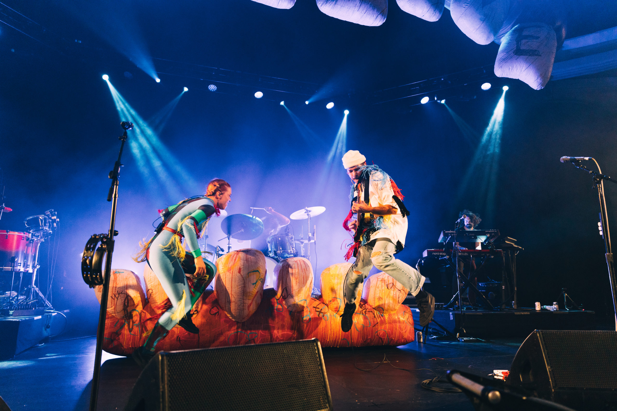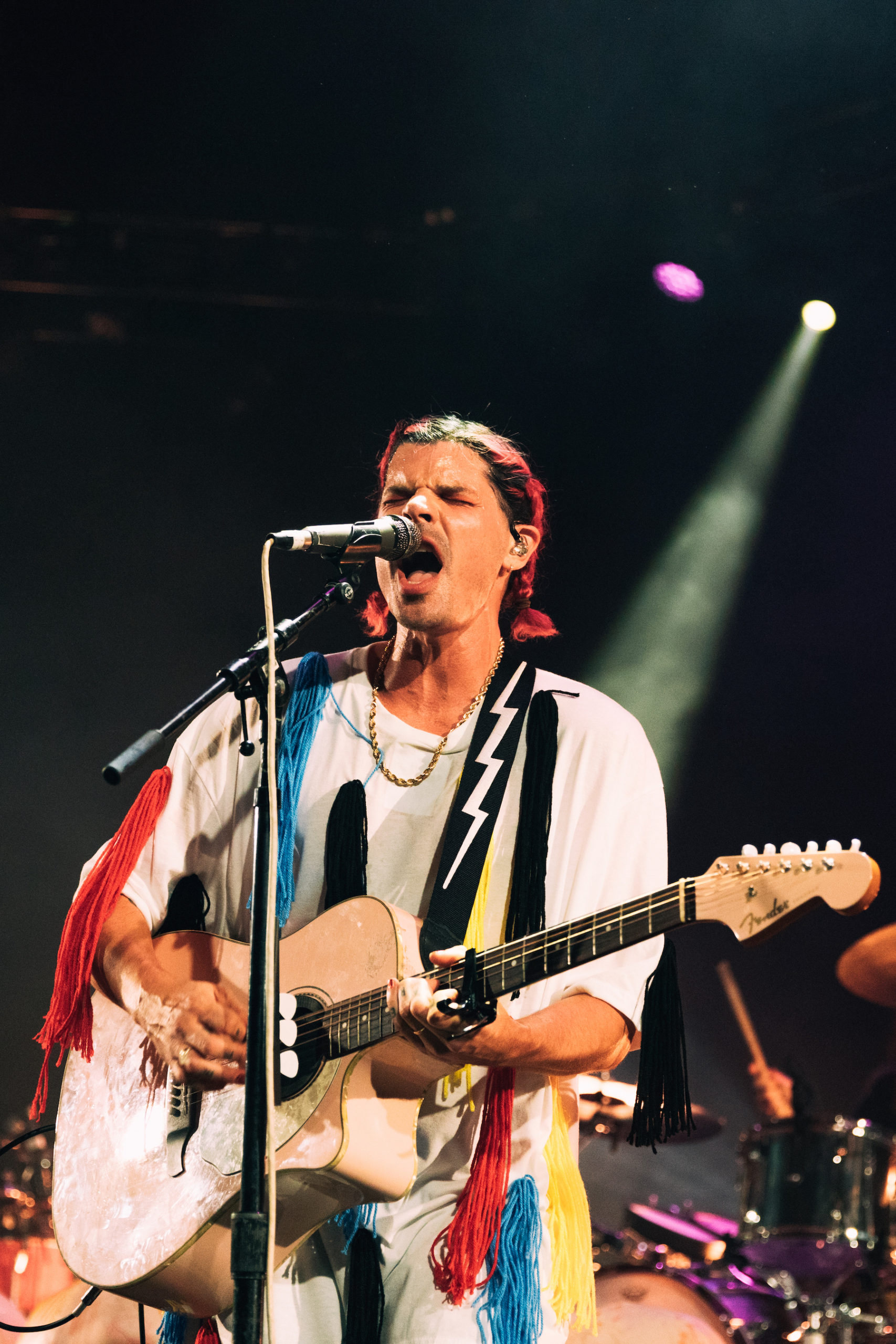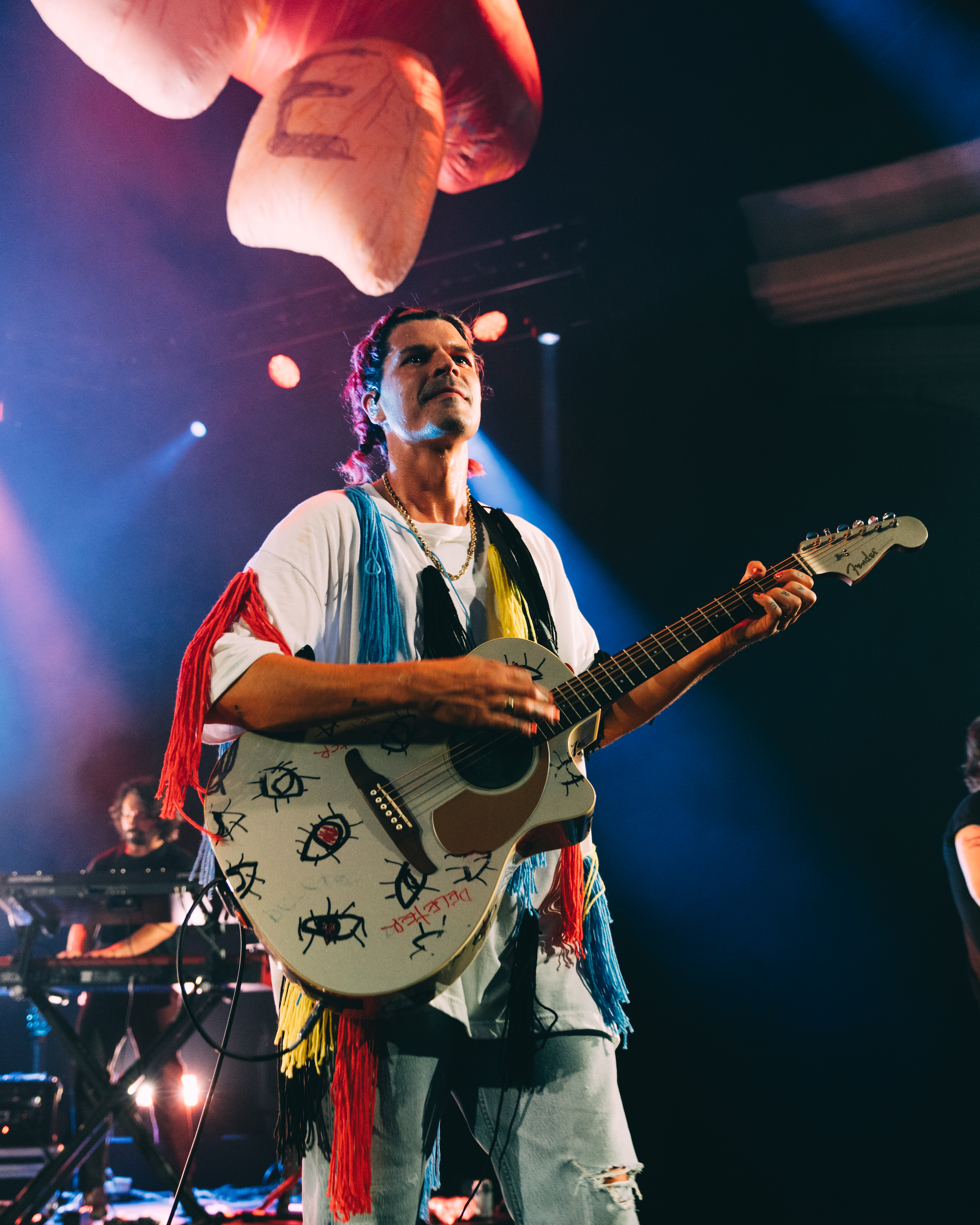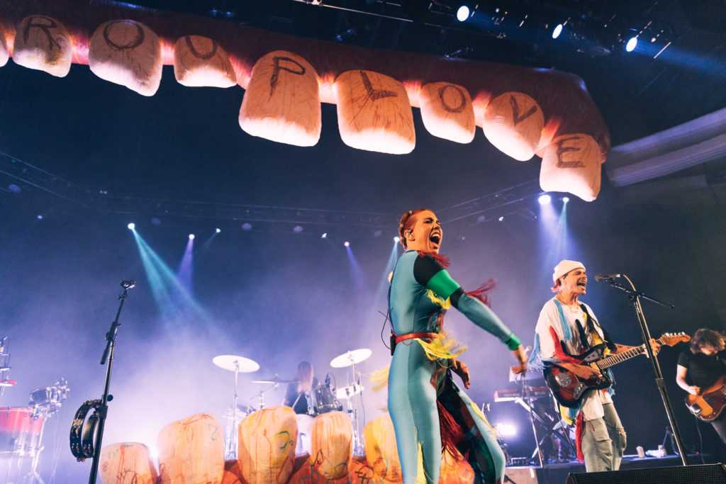 In honor of the 10th anniversary of their debut album Never Trust a Happy Song, Grouplove played a special sold-out show at the Hollywood Palladium last Friday. The band began by playing the celebrated album top to bottom for the first time ever, noting how strange it was to play two of their most popular songs (crowd favorites “Tongue Tied” and “Colours”), typically reserved for the end of their setlist, so early on in the show. While hearing this album in full would be enough to satiate any Grouplove fan, the show didn’t end there – the band continued on to play an additional 10 songs from their later albums. About halfway through the show, Grouplove was joined on stage by two of its former members, drummer Ryan Rabin and bassist Sean Gadd, completing the band’s original lineup for the first time in years. The show was a fitting celebration for the joyful 2011 album; an evening of pure euphoria, it was hard to tell who was having more fun, the fans or the band, as lead vocalist duo Hannah Hooper and Christian Zucconi jumped and twirled around stage adorned in colorful tassel-covered outfits. Check out our photos of the special night below: