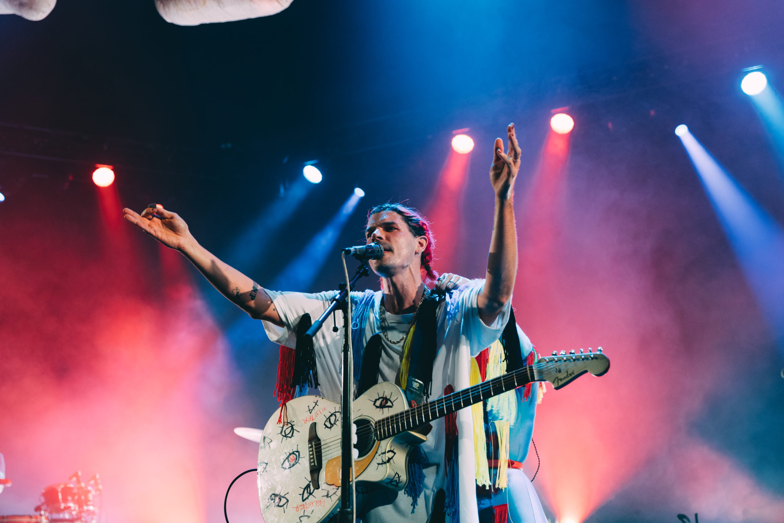 In honor of the 10th anniversary of their debut album Never Trust a Happy Song, Grouplove played a special sold-out show at the Hollywood Palladium last Friday. The band began by playing the celebrated album top to bottom for the first time ever, noting how strange it was to play two of their most popular songs (crowd favorites “Tongue Tied” and “Colours”), typically reserved for the end of their setlist, so early on in the show. While hearing this album in full would be enough to satiate any Grouplove fan, the show didn’t end there – the band continued on to play an additional 10 songs from their later albums. About halfway through the show, Grouplove was joined on stage by two of its former members, drummer Ryan Rabin and bassist Sean Gadd, completing the band’s original lineup for the first time in years. The show was a fitting celebration for the joyful 2011 album; an evening of pure euphoria, it was hard to tell who was having more fun, the fans or the band, as lead vocalist duo Hannah Hooper and Christian Zucconi jumped and twirled around stage adorned in colorful tassel-covered outfits. Check out our photos of the special night below: