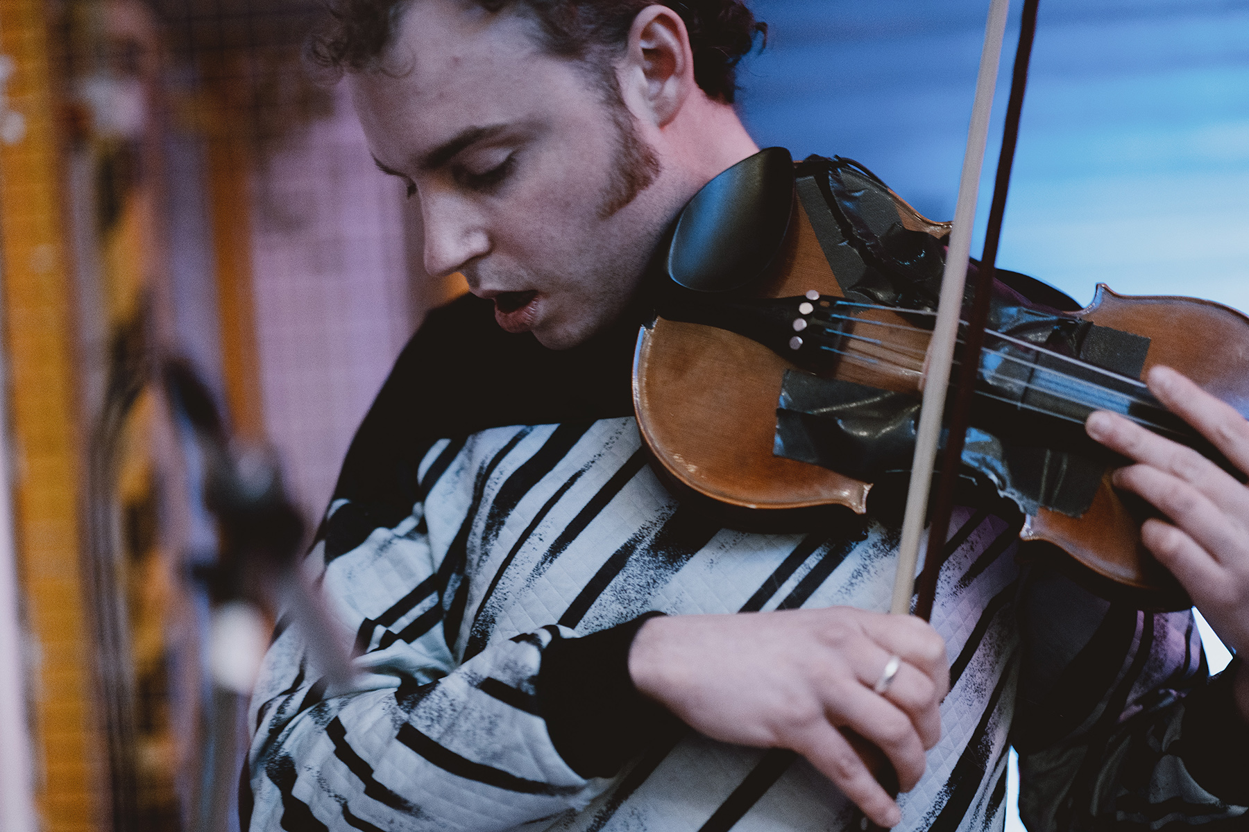 Favourites of course included Hotel Lux‘ breakout 2017 song “The Last Hangman”, mesmeric and intense played live, as well as many from the new album including “National Team” and set-closer “Eastbound and Down”. Frontman Lewis Duffin, his usual charismatic yet humble, lad-down-the-pub persona, delivered earnest vocals much in a spoken-word style. The appearance is a thrown-together new band, but this is a mature impressive sound with many great tunes in the back catalogue and the new album. The performance is exciting and captivating, including an acoustic segment, a little tambourine, a violin held together with gaffa tape, keyboards, and vocals from three of the band.
