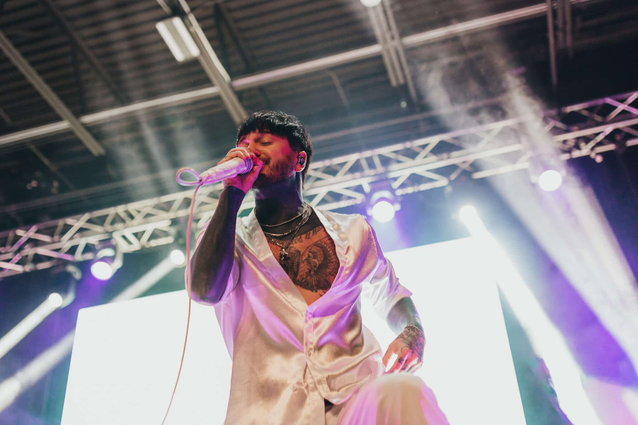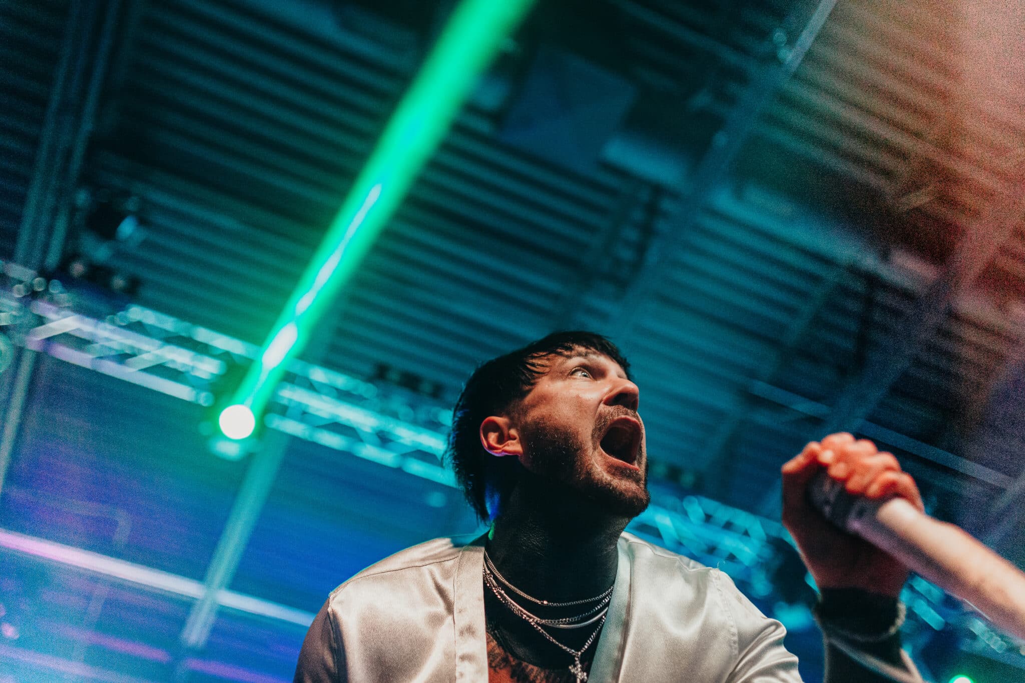 Once the band tore into the “bangers,” as Craig called them, the place went absolutely wild. The fans screamed along to every lyric, turning the room into one giant emo choir. The set hit peak drama near the end when the band briefly cleared out and the house lights dimmed. A haunting, prerecorded voice echoed through the venue: “Hello, hello, can you hear me? Are you ready?” The lights pulsed back on as electronic beats blasted, and Owens reappeared in a simple white tank top, ready to finish the emotional ride.