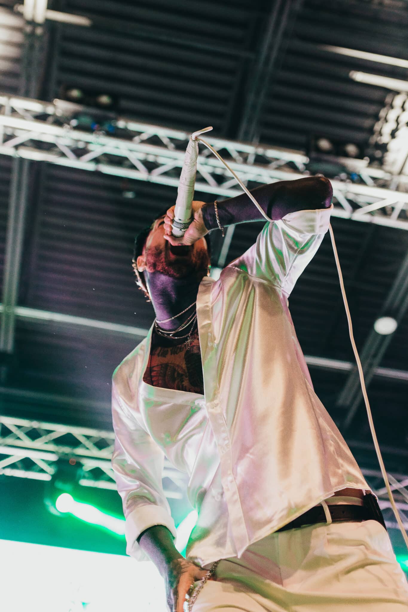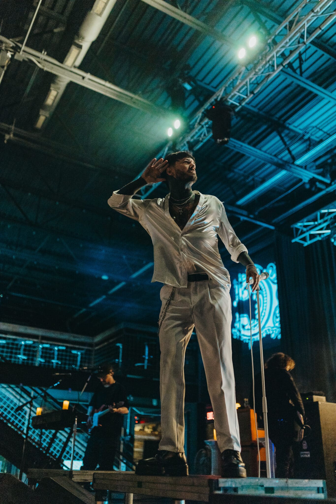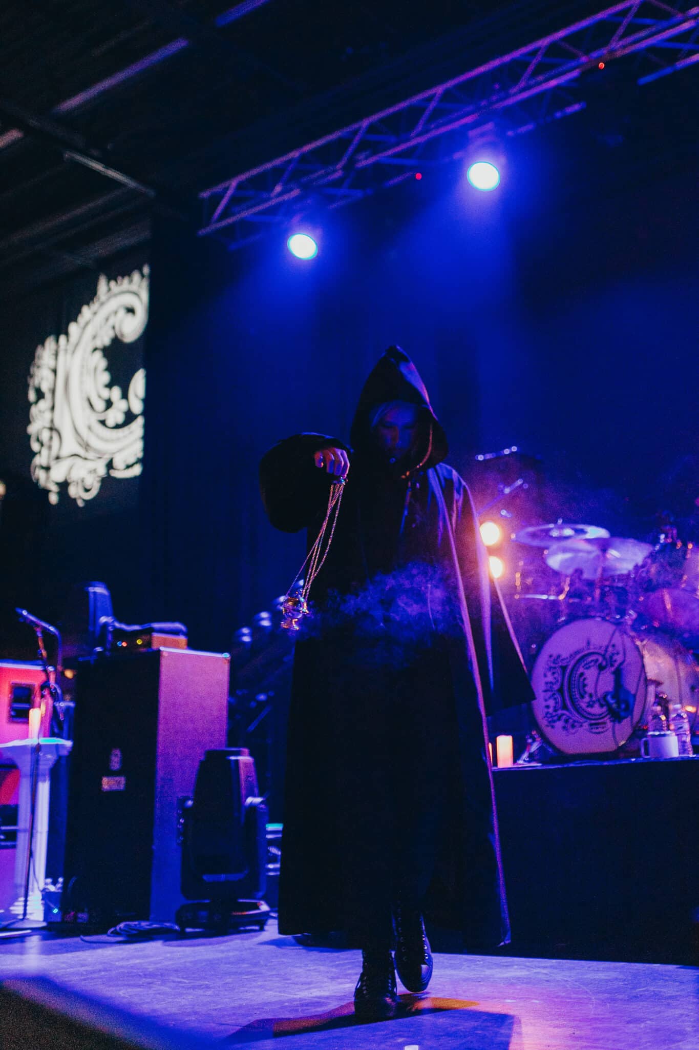 Owens certainly knows how to own a moment. He walked out rocking a stark, all-white outfit sharply contrasted by his platform black Docs. He sipped from a matching white mug like a stage prop, making the whole night theatrical from the jump. Just before Chiodos hit the stage, a mysterious figure in a black cloak even stepped out appearing to “sage” the stage, adding a dramatic touch right before the chaos.