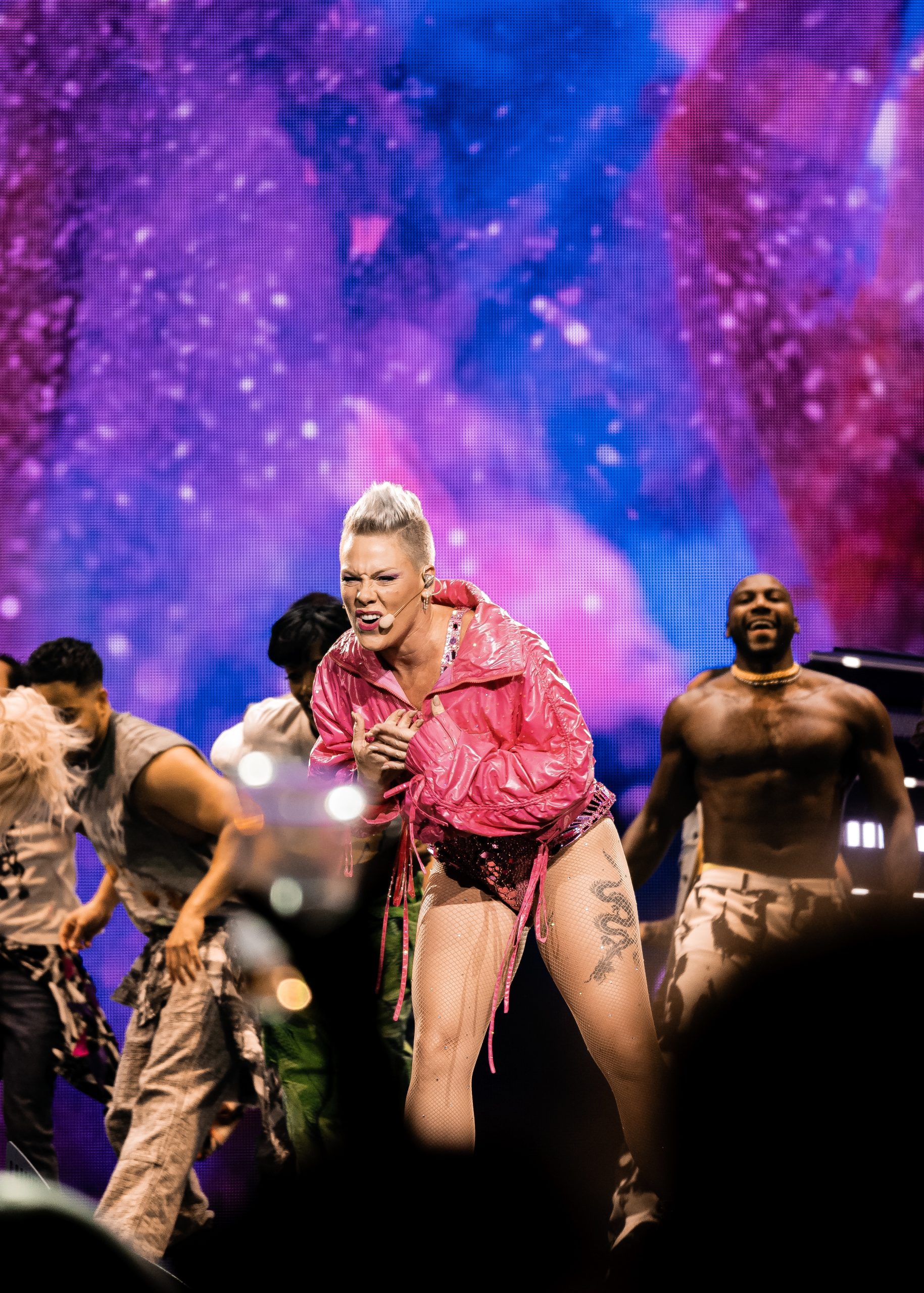 As the packed house waited for Pink to take the stage, fans danced to the nostalgic mixings of DJ KidCutUp. The aisles were filled with acquaintances and friends dancing with another, emitting a blended energy of togetherness and acceptance. The Trustfall logo with snarled lips adorned the top of the stage. Suddenly the venue went dark and overhead stage lighting kicked on. The audience went wild as bright lights filled in the logo lettering and the fierce red lips prepared to debut the iconic headliner. The spotlight centered on Pink, who appeared between the top and bottom lip, taking a moment to smile at roaring fans. She soaked in that moment with the crowd before performing ariel stunts, descending into a dive like motion to the stage floor. Pink kicked off the evening with “Get the Party Started” from her 2001 album M!ssunderaztood, impressing the audience with ariel acrobatics in her rhinestone and sequin pink leotard with matching bedazzled platform boots. Comin’ up and getting the party started, she launched into the air with her accompanying dancers, supporting her through every sky-high move.
