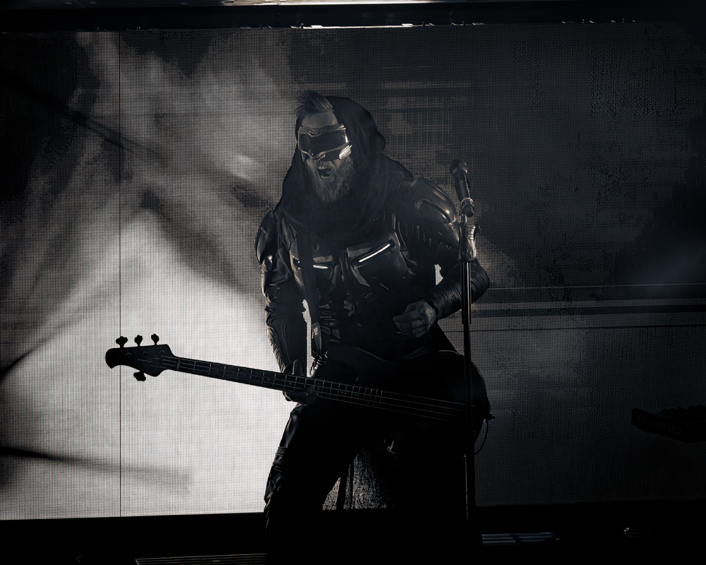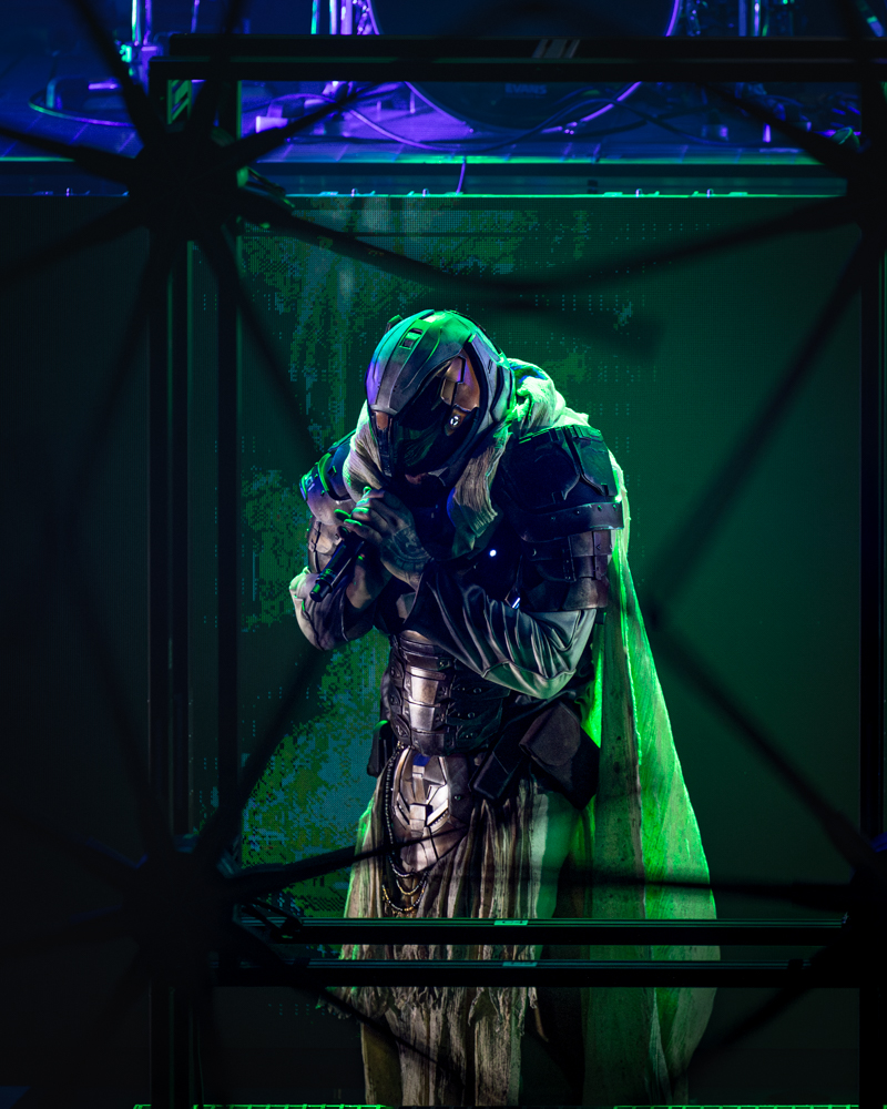 Although Starset took the stage slightly later at 8:30 due to the sizable crowd still entering the packed venue, they ensured that every fan was inside before starting. The unveiling of the double-decker stage left everyone in awe, immersing the audience in a cyberpunk/sci-fi narrative displayed on screens between songs. These films, resembling video game cutscenes, complemented Starset’s performance impeccably. The band members’ attire, reminiscent of Dune, enhanced the futuristic ambiance.