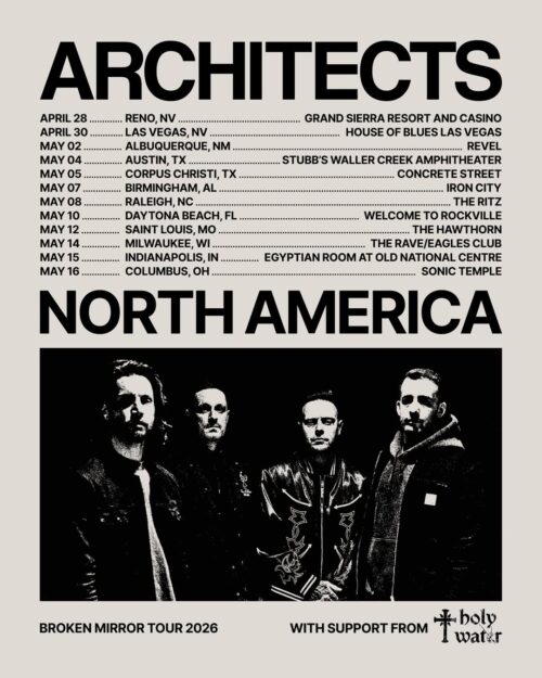 Following a landmark year in 2025, Architects have announced their return to the United States with a 2026 headlining tour, joined by rising hard-rock act Holywatr–their second tour together. The run kicks off April 28 in Reno, Nevada, and will see the band perform a series of select headline dates alongside appearances at major rock festivals Welcome To Rockville and Sonic Temple.