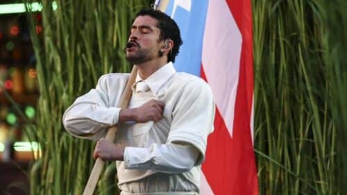 The performance incorporated many symbolic and cultural references: the set display of sugarcane plantation workers wearing traditional pava hats, the tíos playing dominoes, the New York-style bodega, an in-real-time wedding ceremony, a child asleep on plastic chairs, and a family watching Benito’s acceptance speech. There were also electrical poles used to symbolize regular power outages the island of Puerto Rico faces, a taco stand, a piragua stand and a coco frio stand, and a display of flags from all the countries of South, Central, and Latin America.