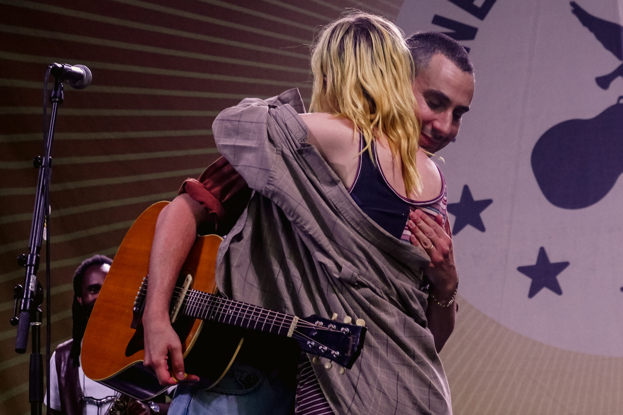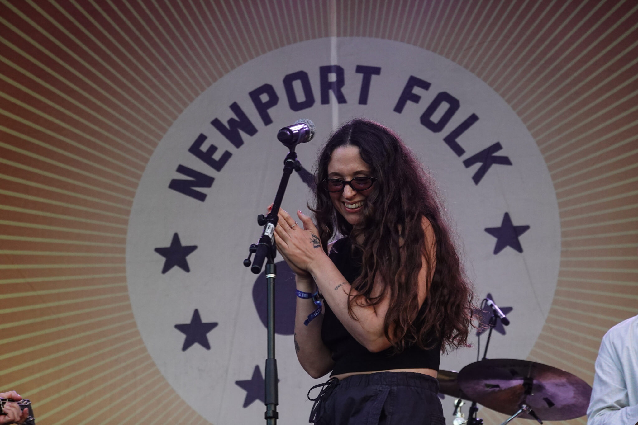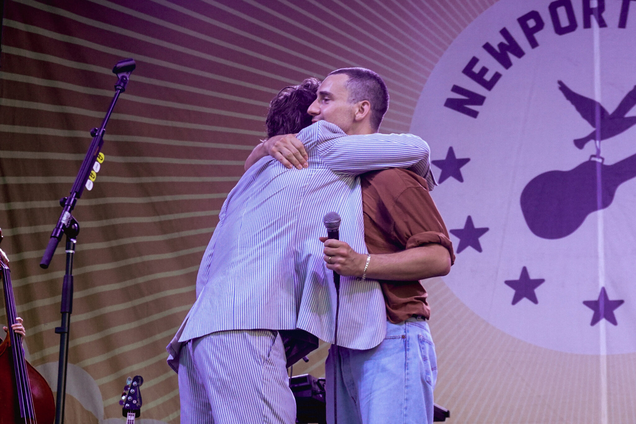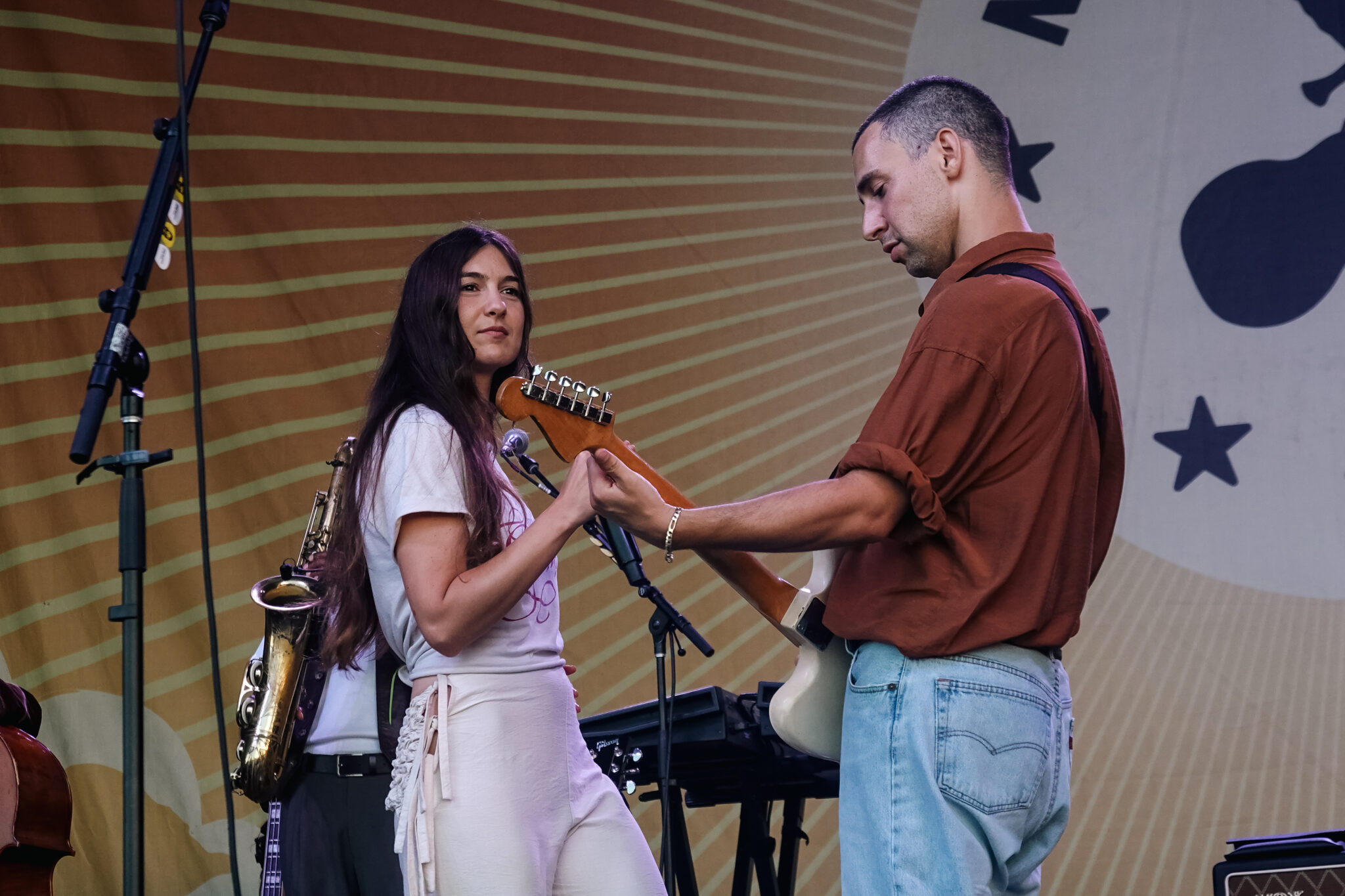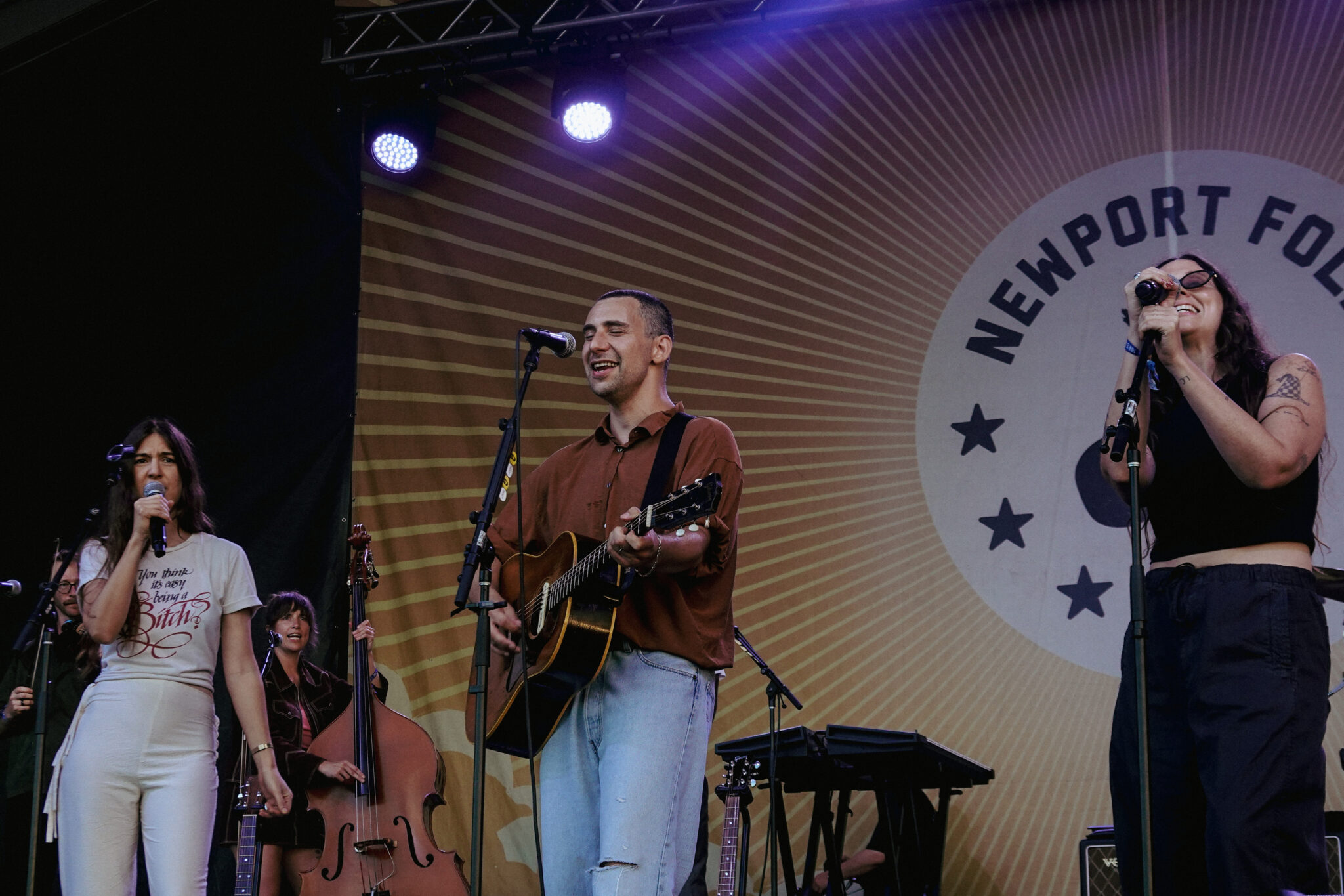 Bleachers kicked off the set with a handful of their own hits, including “91,” “Rollercoaster,” and “Goodmorning.” The first guest to join them on stage was Weyes Blood, who teamed up with the band for a dreamy cover of “Dream a Little Dream of Me.” Next up was Waxahatchee, joining Antonoff and company for a spirited rendition of Roy Orbison’s classic “You Got It.” Covers like these are a beloved tradition at Newport, where surprise collaborations and reinterpretations often steal the show. Continuing the spirit of collaboration, Antonoff then welcomed Dan Reeder and his daughter Peggy to perform Reeder’s song “Maybe.”