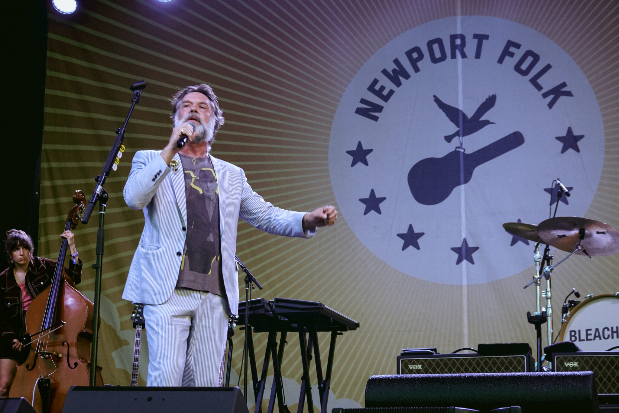 Jeff Tweedy of Wilco followed with a performance of Lana Del Rey’s “Margaret,” a song she recorded with Bleachers that was inspired by Antonoff’s wife, actress Margaret Qualley. Tweedy and Antonoff had previously performed the track together during a Bleachers show in Chicago last summer, making its Newport appearance a reunion of sorts. After “Margaret,” the band shifted into Wilco’s own catalog, performing the early-2000s track “Kamera.” The pairing highlighted the blend of personal storytelling and collaborative spirit that defined much of the night’s setlist.