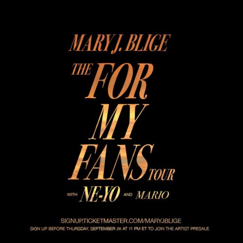 Blige’s For My Fans Tour, which will begin in January 2025, is available for artist pre-sale starting this Thursday, Sept. 26 at 11 p.m. ET. The tour will include support from Mario and Ne-Yo, with official dates to be announced soon. Fans can sign up for more information and access to tickets here.