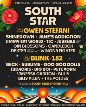 C3 Presents is bringing Huntsville, AL their first multi-day, large scale festival festival in 13 years, South Star Music Festival. The festival will be held at John Hunt Park on Saturday, Sept. 28, and Sunday, Sept. 29. South Star boasts an iconic lineup with headliners Gwen Stefani and Blink-182. Joining them during this star-studded weekend are acts such as Jimmy Eat World, Ludacris, TCL and Vanessa Carlton.