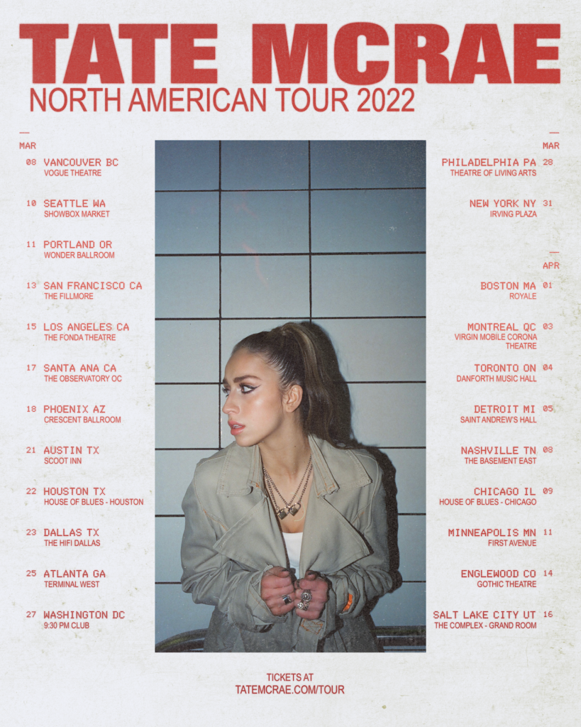 “you broke me first” singer Tate McRae announced her 2022 North American Headlining tour. The tour will span across 23 dates and begin on March 8th in Vancouver, Canada and end on April 16th in Salt Lake City. In addition to her tour, Tate will be playing Wonderstruck Music Festival, Lollapolooza, Leeds Festival, Reading Music Festival, Bonnaroo, Music Midtown, Firefly, Governor’s Ball, Austin City Limits and more!
