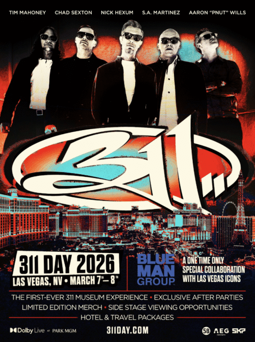 The band’s 26th annual party hits Las Vegas for the 12th time at the top of March 2026, the celebration going citywide. The party will include the first ever 311 museum experience, after parties, side stage viewing, and more. With this being their most immersive event to date, you won’t want to miss out. The iconic Blue Man Group will be joining the stage for select songs.