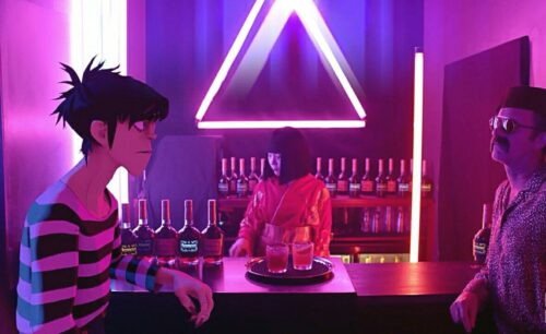 Later on, in the video for “Strobelite” that takes place at a lively nightclub, Noodle and 2-D dance the night away, while Russel dozes off. Murdoc, though, is busy making some shady-looking deals with a shady-looking guy.