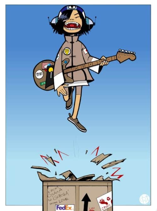 In an effort to fill the new opening, Murdoc put out a flyer in NME Magazine that read “Global phenomenon seeks guitarist for world domination – No Hippies.” Not long after, a FedEx box arrived at Kong Studios, and out of it leapt a 10-year-old Japanese child. She immediately played a sick guitar riff, ending it by saying only one word: “Noodle”. The band concluded that she suffered from amnesia, since she couldn’t remember her real name, where she came from, or her life before arriving at the steps of Kong Studios in this FedEx crate. Even so, Noodle‘s love of music, her optimistic outlook, and her jokes at Murdoc’s expense made her a perfect fit for the band.
