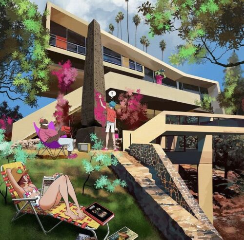 After another hiatus, the band settles into a mansion in Silverlake, LA, to start recording their latest album. Murdoc has other things on his mind, though. He’s been thinking a lot about “The Prophecy,” and having delusions that he should start a cult, and be their glorious leader. He’s also busy crushing on one of their new neighbors, a lady named Moon Flower. Murdoc even buys a massive obelisk, that he asks 2-D to paint bright pink, and places it on their front lawn to impress her, but she didn’t notice.