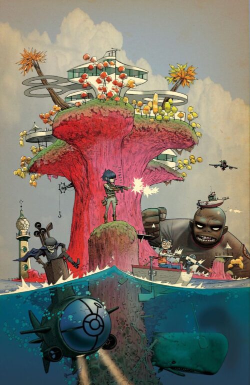 Back to the band, the Stylo-shark-submarine rises to the ocean’s surface as Murdoc spots The Boogeyman atop a tall plateau, and orders Cyborg Noodle to open fire on him. The Boogeyman falls into the endless ocean, swimming away as the fog clears, to reaveal Plastic Beach in all it’s glory.